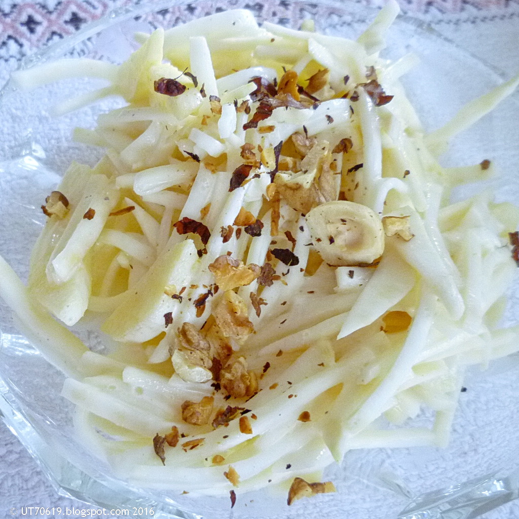 1. Die Sellerieknolle schälen und in dünne Streifen schneiden.
